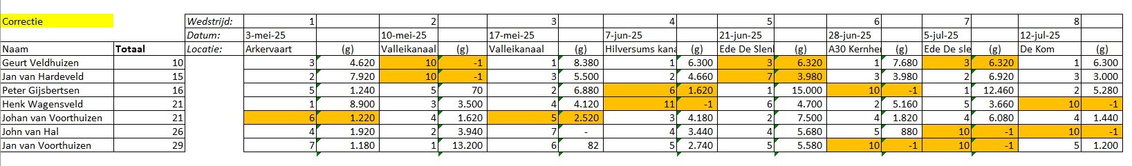Eindstand zaterdag Competitie 2025 - 8 Wedstrijden, 2 afvallers. Correctie toegepast van 2 slechtste wedstrijden!